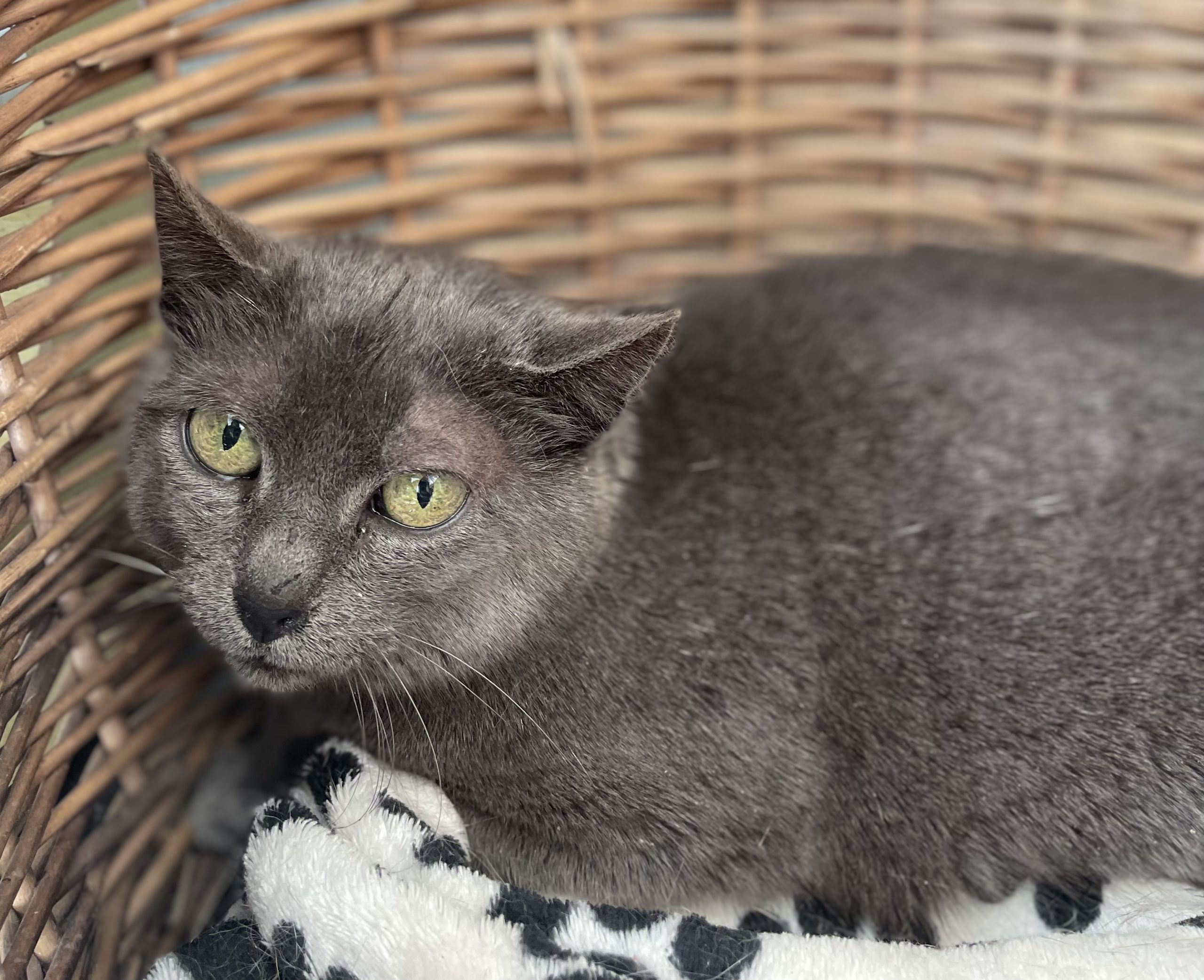 Très apeurée, BOOM chercherait plutôt à se faire oublier pour l’instant. Pas à l’aise à la chatterie, elle ne viendra sans doute pas vers vous. Elle a cependant un atout de taille: son magnifique pelage et des yeux verts. Très certainement, un de ses aïeux devait être chartreux. De la douceur, de la patience et beaucoup d’amour sauront venir à bout de cette réserve. Votre cœur fera-t’il BOOM?